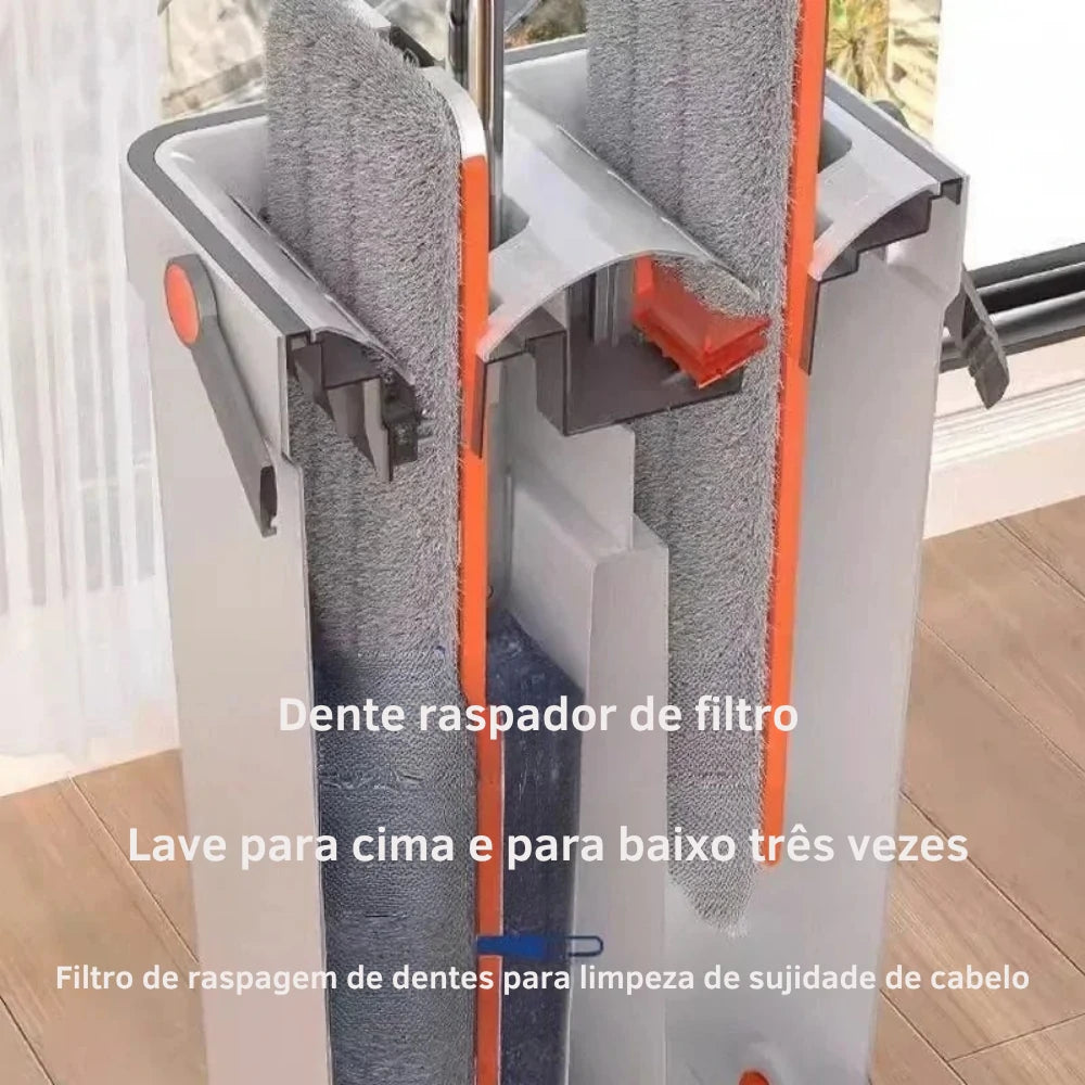 Conjunto completo com balde de duas câmaras que lava e espreme sem tocar em água suja, ideal para a manutenção diária do lar.